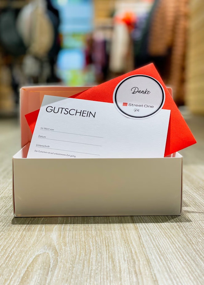 Unsere Gutscheine sind passende Geschenke für Geburtstage, Weihnachten oder einfach, um seinen Liebsten eine Freude zu bereiten. Bestellen Sie bequem online und Sie erhalten den Gutschein verpackt per A-Post. Die Rechnung für die Bezahlung werden wir Ihnen beilegen. Die Gutscheine sind auf unbestimmte Zeit gültig und einlösbar im Street One Store und allen unseren Partnergeschäften.